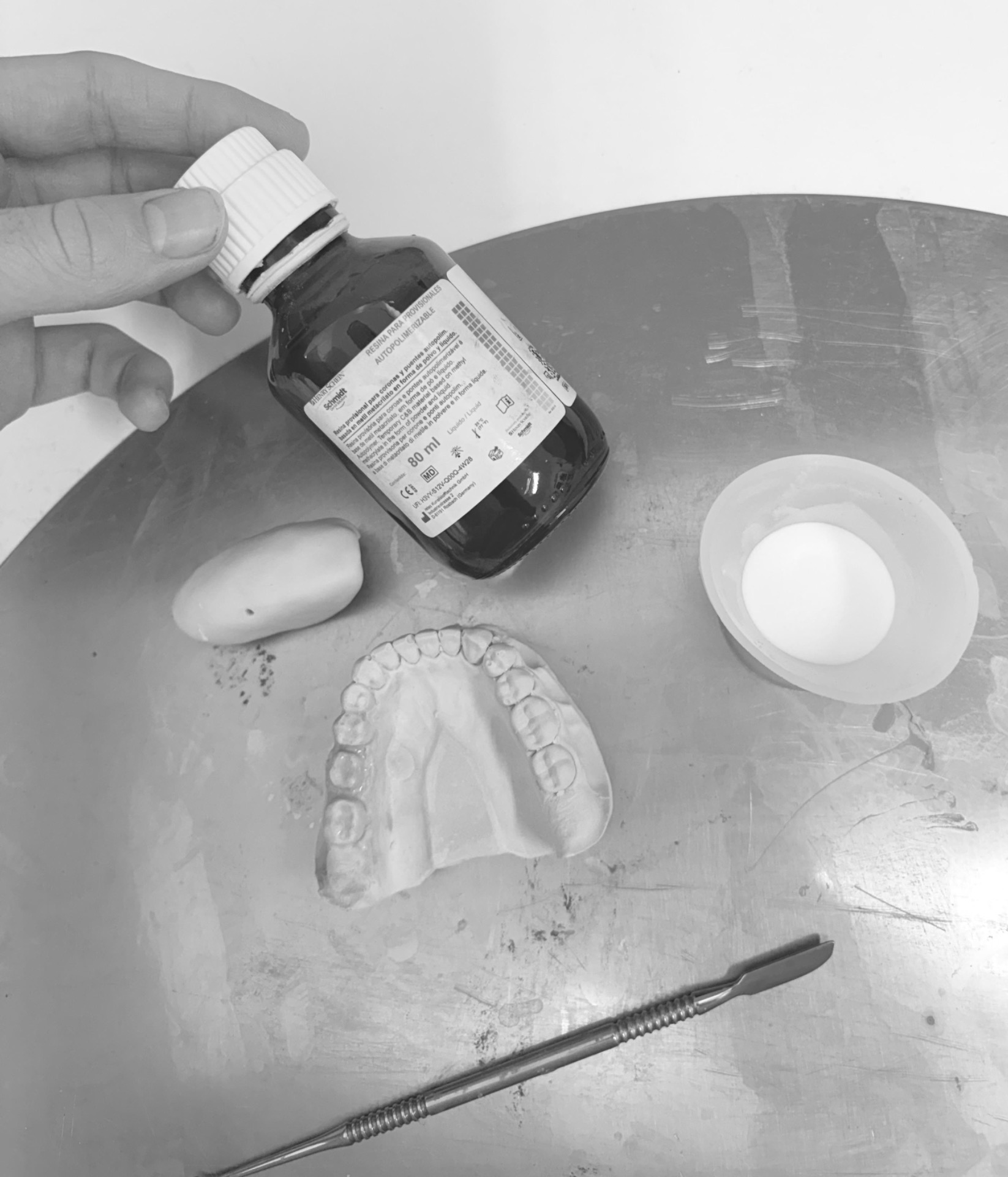 - Resina: Pondremos la resina mediante la técnica de estampación. La resina la deberemos de preparar poniendo el polímero y monómero en la taza de silicona e iremos colocando la resina con la ayuda del espatulin sobre la llave de silicona.