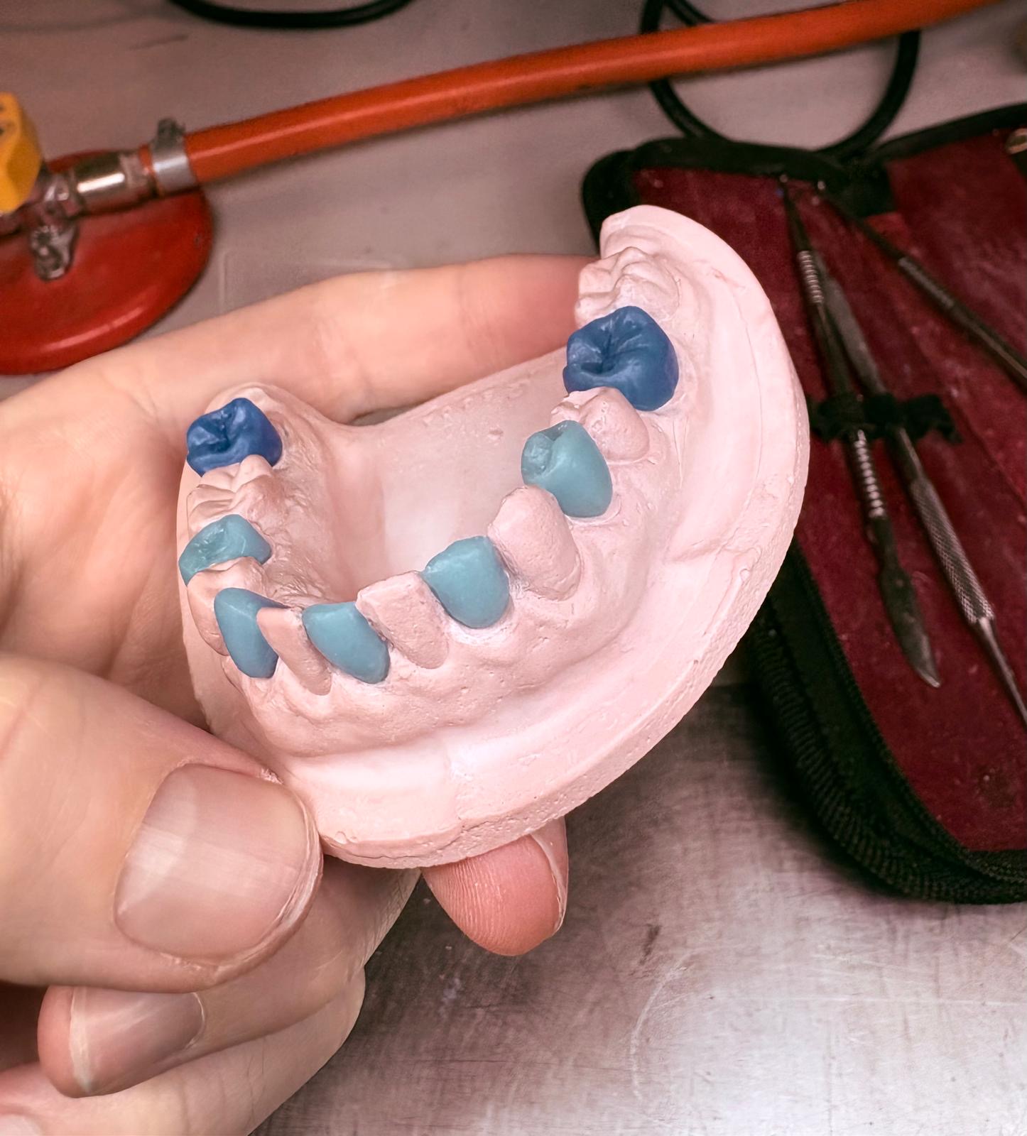 -Esta práctica consistirá en modelar con cera azul el modelo inferior de las piezas dentarias manteniendo y realizando una correcta anatomía y unos buenos puntos de contacto.